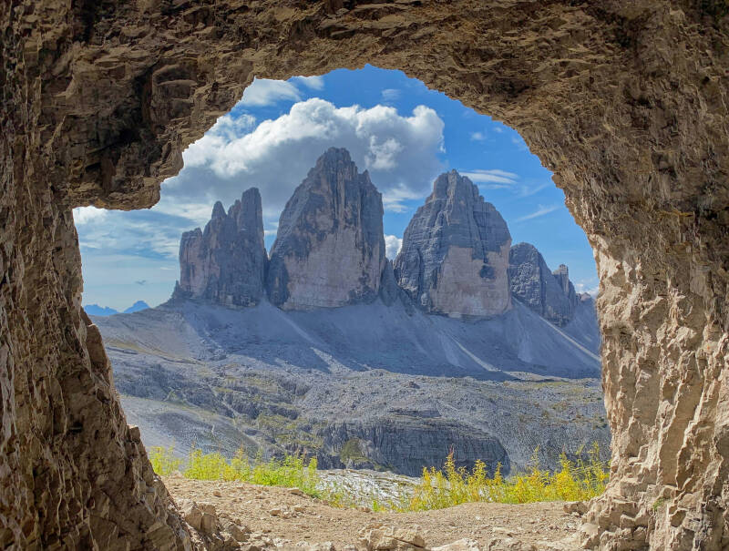 Von der Auronzo Hütte ging es über den Lavaredo-Sattel zum Einstieg des Klettersteigs am Paternkofel. Klettergeschirr angelegt ,ein Foto von uns und wir verschwanden in dem alten Militärstollen um nach kurzer Strecke an der Längsseite des Paternkofels wieder ans Tageslicht zu kommen.