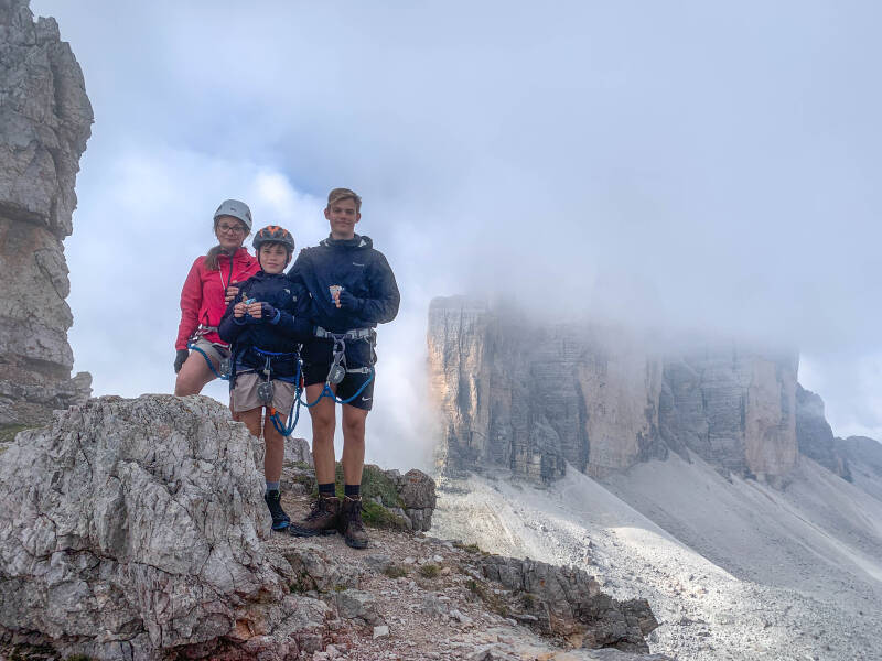 Gegen 13 Uhr 30 erreichten wir unser Ziel, die Drei Zinnen-Hütte. Für mich waren sie alle Helden an dem Tag. Meine Tochter weil sie zum ersten Mal im Klettersteig war und sich tapfer geschlagen hatte. Der "Große" weil er wie immer souverän im Berg unterwegs war und jedem half. Der "Kleine" unerschrocken, ohne müde zu werden und mit viel Spaß bei der Tour. Der Opa war froh das alle gesund am anderen Ende vom Berg angekommen sind. Übrigens, das Gewitter blieb aus. Aber hinterher ist man sowieso gescheiter. Auch ohne Gipfelkreuz war es eine schöne und erlebnisreiche Bergtour!