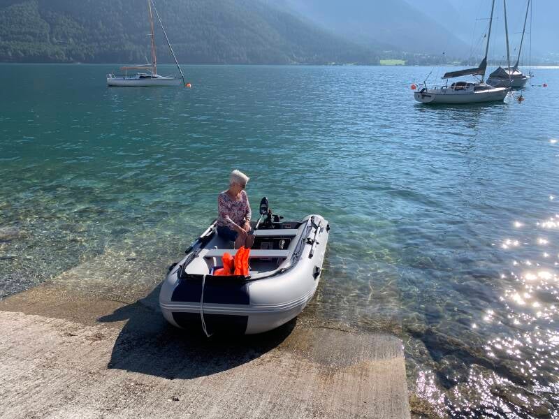 Speedboot ist natürlich übertrieben. Am Achensee sind soweit ich informiert bin aktuell nur Elektromotoren bis 2200 Watt Vortriebsleistung zulässig. Der Motor am Schlauchboot leistet nur 500 Watt. Das heißt bei ruhiger See kommt man einigermaßen gut voran. Bei etwas Wellengang gehts nur mühsam vorwärts, zumindest mit dem Schlauchboot. Das Boot mit 3,80m Länge reicht für uns beide. Wir waren aber auch schon zu viert an Bord.