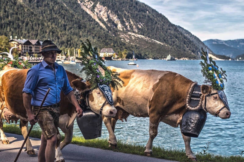 Herbstzeit ist auch Almabtriebszeit. Wenn die Kühe von der Sommerfrische auf den Almen heimkehren, ist das jedes Jahr ein fröhliches Fest. So auch am Achensee. Es gibt einige von solchen Almabtriebe rund um den See. Einer davon führt von der Gramai nach Pertisau mit Halt im Dorf weiter am See entlang Richtung Maurach. Ein anderer führt von Achenkirch in der umgekehrten Richtung zuerst nach Maurach von dort am See entlang nach Pertisau. Da beide bei uns am Haus vorbeikommen nutze ich die Gelegenheit für Fotos. Natürlich sind die Almabtriebe auch ein Spektakel für die Urlauber die sich zahlreich alles anschauen. Der Almabtrieb ist eine in Tirol bereits seit Jahrhunderten bestehende Tradition. Die heiteren Volksfeste, die bei der Ankunft der Tiere im Tal gefeiert werden, sind Ausdruck des Dankes für einen unfallfreien Sommer auf der Alm.