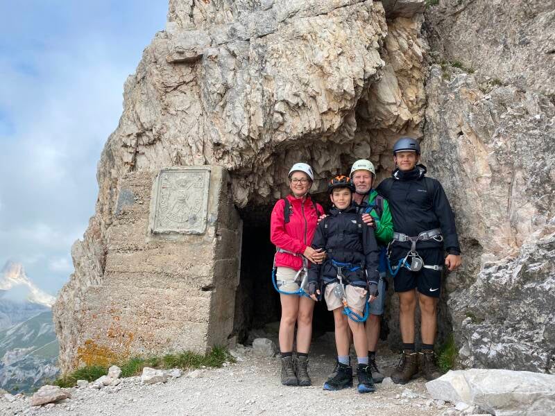 Von der Auronzo Hütte ging es über den Lavaredo-Sattel zum Einstieg des Klettersteigs am Paternkofel. Klettergeschirr angelegt ,ein Foto von uns und wir verschwanden in dem alten Militärstollen um nach kurzer Strecke an der Längsseite des Paternkofels wieder ans Tageslicht zu kommen.