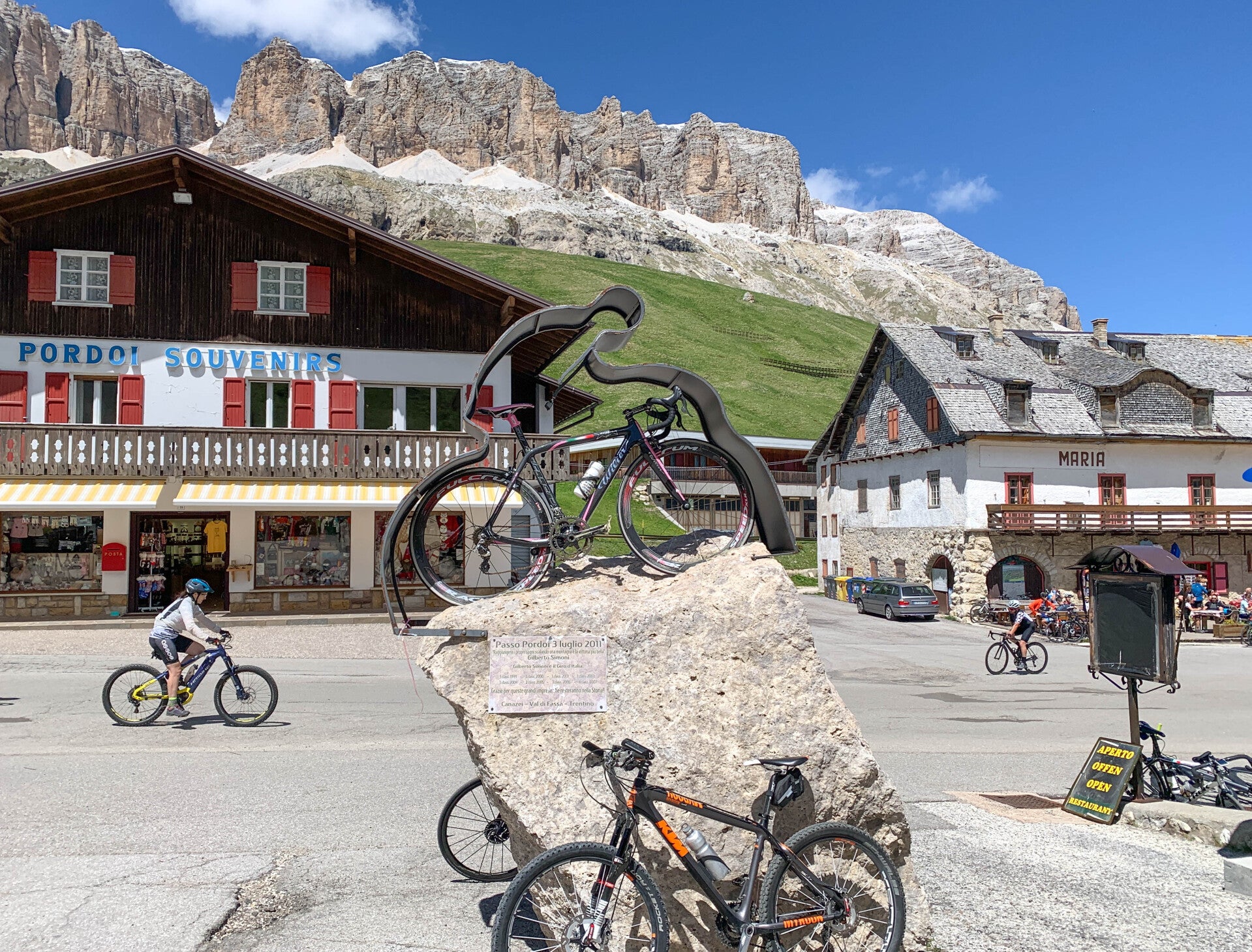 Beim 3. Anstieg zum Pass Pordoi merkte ich das meine Kräfte so langsam nachlassen. Die Kurbel drehte sich nicht mehr so ganz rund. Zeit für eine Pause. Zunächst aber noch das Denkmal von Gilberto Simoni an der Passhöhe besuchen. Immerhin war er zweimaliger Giro d'Italia-Sieger. Danach die 9km lange Abfahrt nach Arabba. Ein Genuss für jeden Radlfahrer. Einfach wunderschön.