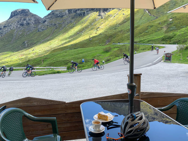 Bei der Abfahrt hinunter nach Arabba kurzer Halt für einen Kaffee und Kuchen. Schließlich kommt noch der vierte und letzte Anstieg zum Campolongo Pass und ich weiß das der sich kräftemäßig zieht. Außerdem machte mir die Hitze auch zu schaffen. Mit dem Wissen das dies der letzte Anstieg für heute ist werden die letzten Kraftreserven mobilisiert. Endlich kommt das begehrte Hotel an der Passhöhe in Sicht. Es ist geschafft. Hier gibt es wie für viele andere Radlfahrer ein eiskaltes Radler im Biergarten. Danach geht es nur noch bergab Richtung Corvara.